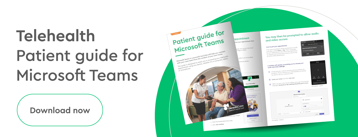 At GenesisCare telehealth consultations are conducted over Microsoft Teams. Download our patient guide for Microsoft Teams for detailed instructions on how to access and manage your appointment.