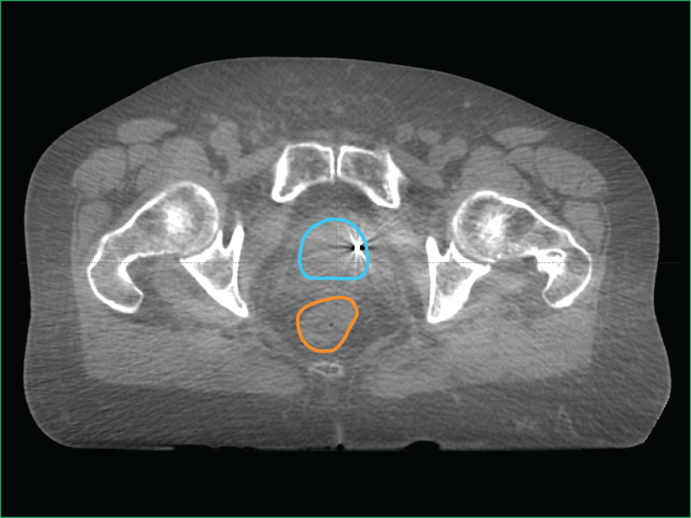 - Planned target volume outlined in blue