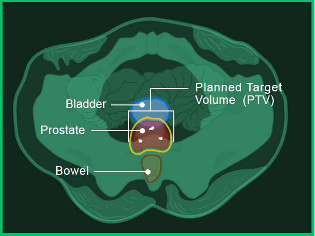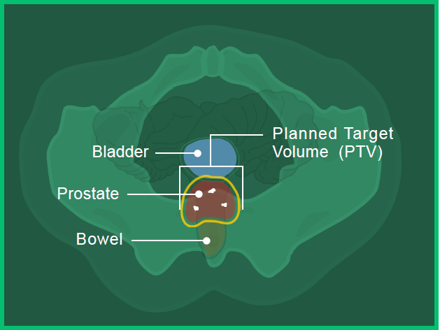 - Planned target volume outlined in yellow (where the radiation will hit)